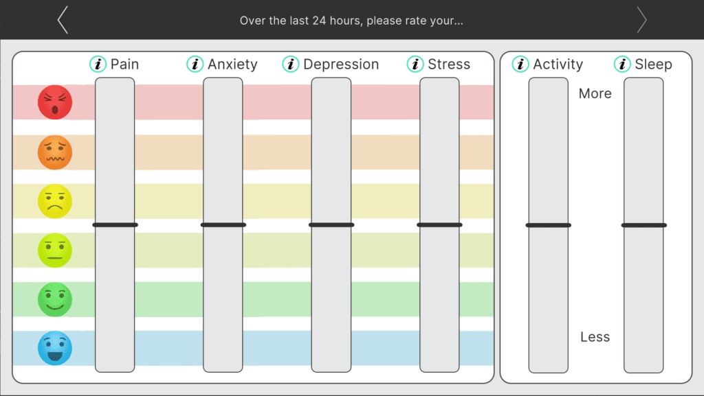 Alevia app’s interface for tracking key health metrics over time, including pain, anxiety, depression, stress, activity, and sleep.